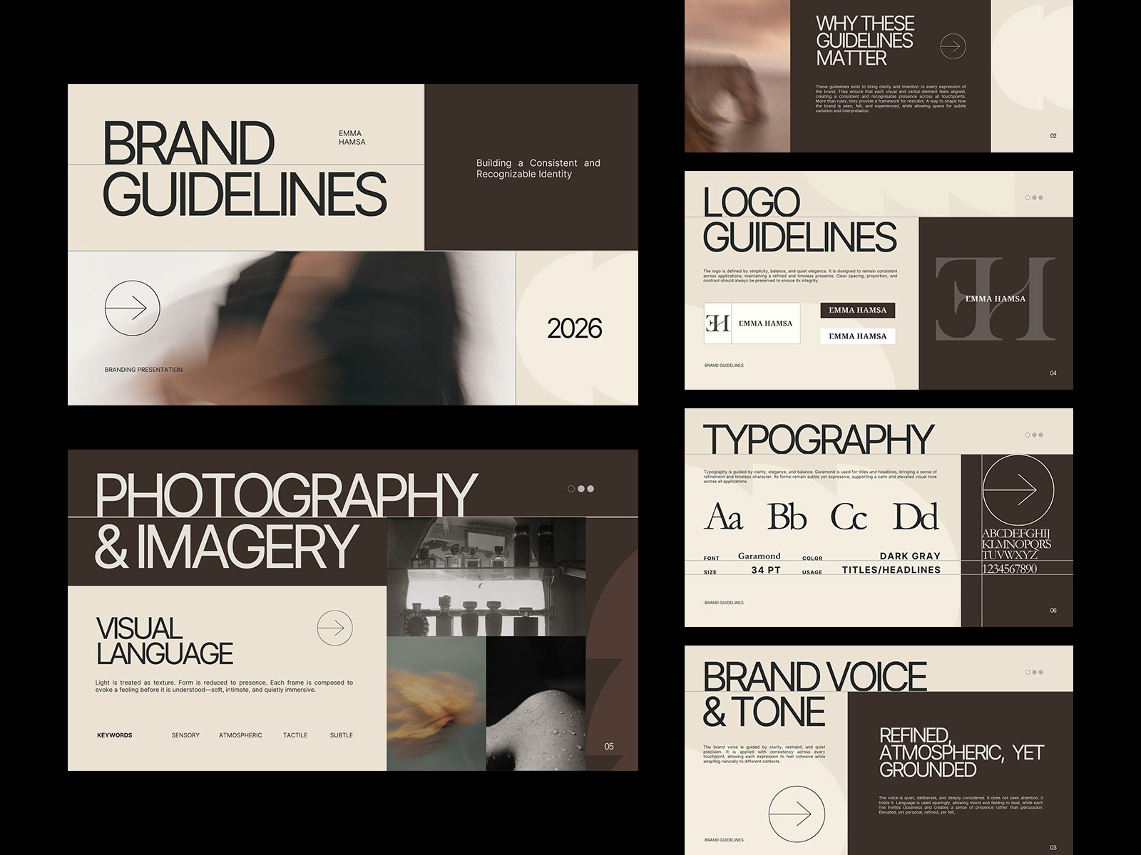 Unified visual direction using minimal layouts, muted tones, and refined typography.