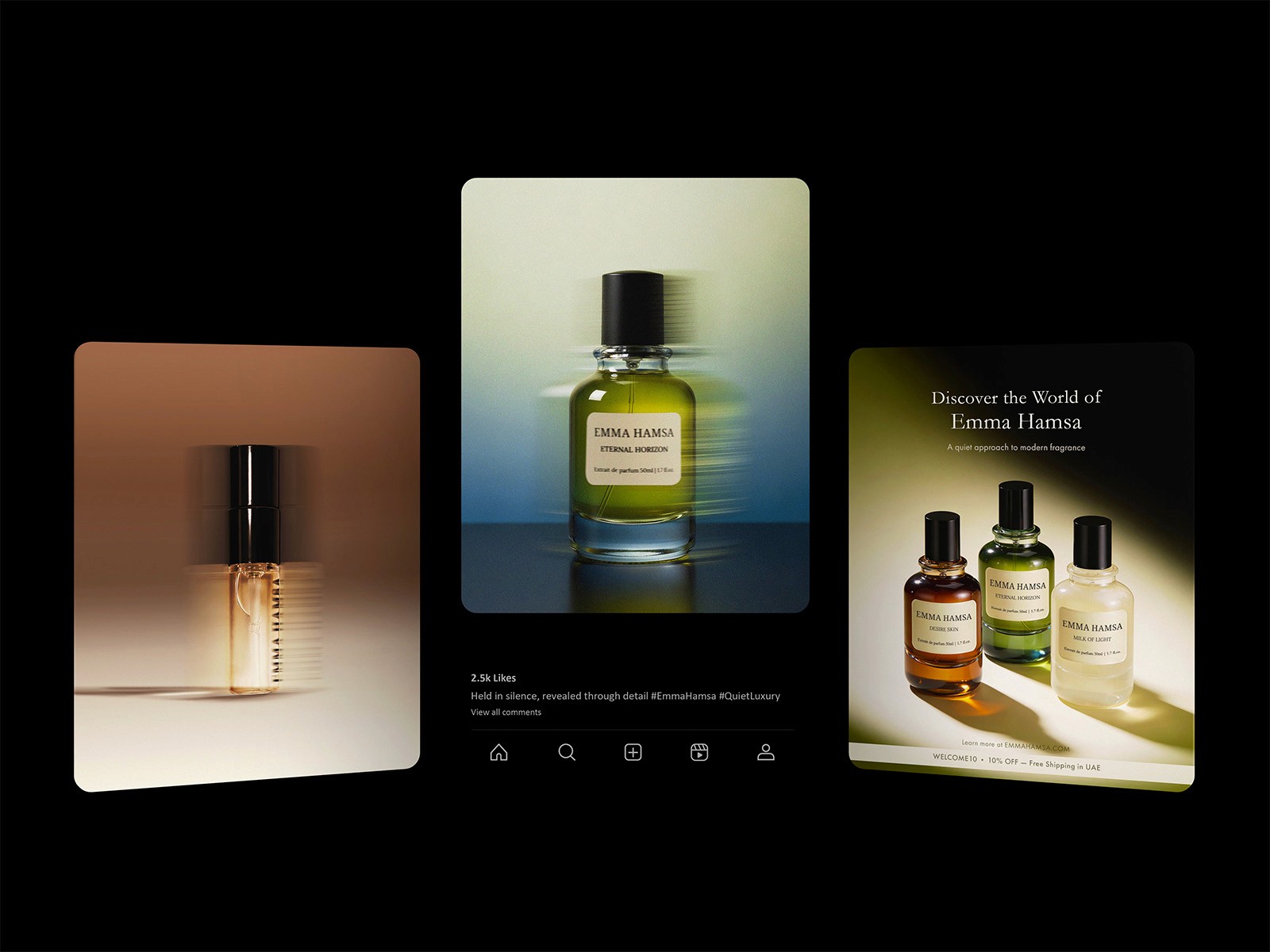 A refined social feed design for a fragrance brand, shaped through quiet luxury aesthetics and a cohesive visual tone.
